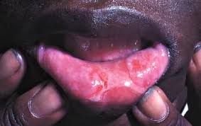 有痛性の口内炎(全身性エリテマトーデスの無痛性口内炎と対照的)が特徴ですが、一般的な原因による