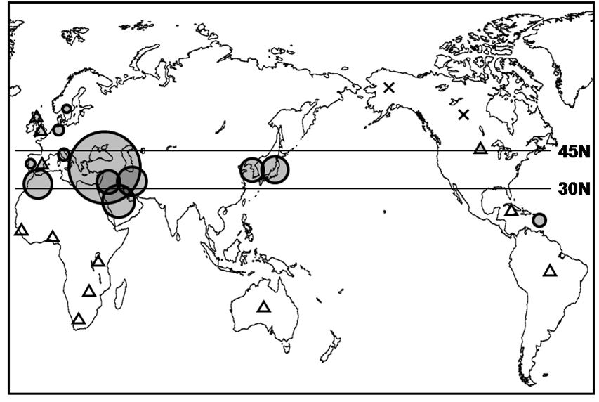 シルクロード沿いの地中海、中近東 東南アジアに多い。