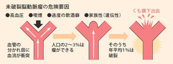 ストレスなどにより血圧上昇が起こると脳動脈瘤が破裂し、脳内へ出血します。
