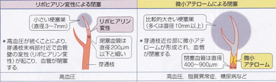 高血圧などによる動脈硬化が原因で血管の壁に変性(リポヒアリン変性)が起こり、比較的細い血管が閉塞することで