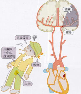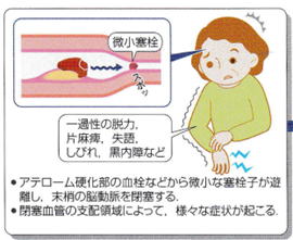 頸動脈などの太い動脈にできた血栓の一部がはがれて血流にのり、末梢血管に詰まることで神経脱落症状を呈し、