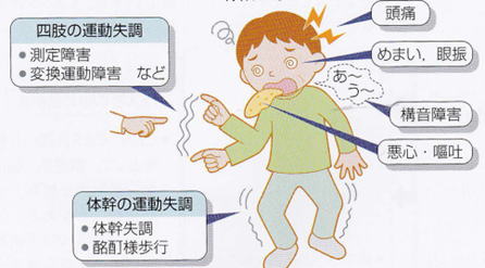 めまいのほか、ろれつが回らずしゃべりにくい、手足が動かしにくい、字がふるえてかけない、立ったら倒れてしまう