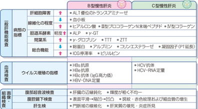 肝機能検査、ウイルスマーカーの検索、組織学的検査