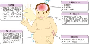熱、頻脈、副水・浮腫、黄疸、肝性昏睡度U度以上の意識障害なども見られる場合もあります。