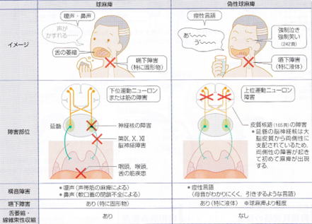 球麻陣(延髄の運動神経核Z、\、X、IUの麻痺)に伴い、以下の症状が顕著です。