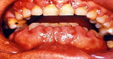 非炎症性のピンク色の歯肉、硬い線維性の増殖が起こります。