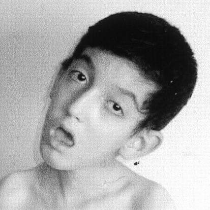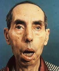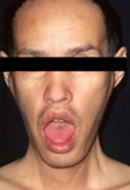 オノ様顔貌、眼瞼下垂、仮面様顔貌、開咬。前頭部禿頭(トクトウ)