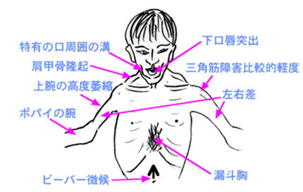 臨床症状は重症で、出生時よりの哺乳困難、啼泣微弱、著明な筋緊張低下、筋力低下、顔面筋罹患、多関節拘縮、