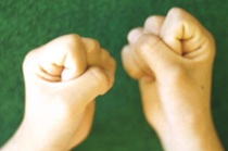 膝に手をついて自分の体によじ登るような 立ち上がり方をします。