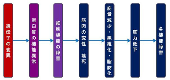 その欠損・変異は、細胞内シグナル伝達系の異常をもたらし、不可逆的な筋繊維壊死・筋力低下・疲労などの症状を