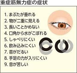 筋肉の力が弱くなる病気で、疲れやすくなったり、眼瞼下垂(まぶたが下がる)、複視(ものが二重に見える)、