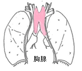 胸骨の裏にある組織で、骨髄で作られた未熟なリンパ球(Tリンパ球)が正常に働くようにする役割を担っています。