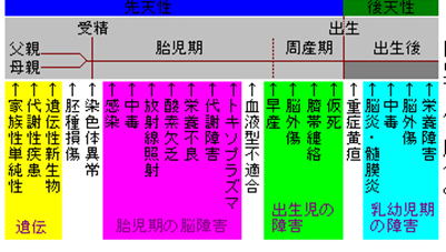 周産期仮死、低体重出生、核黄疸が挙げられ、脳障害の病因発生の時期に応じて、胎生期・周産期・出生後に分けられる。