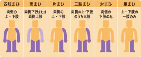障害が現れる部位によって片麻痺、対麻痺、四肢麻痺、両麻痺などに分類される。