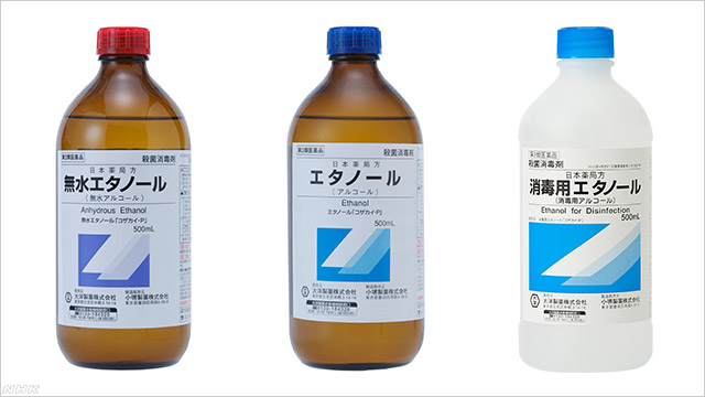 エタノールの種類は、無水エタノール、エタノール、消毒用エタノールの三つがあります。