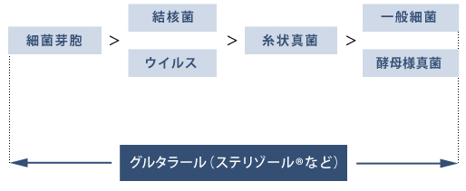 ほとんど全ての細菌、真菌、芽胞、ウイルスに対しグルタルアルデヒドと同等かそれ以上の効果を示すが、