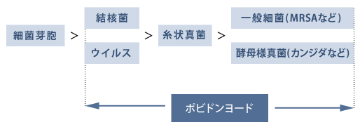 ポビドンヨードの殺菌作用はヨウ素の酸化作用によるため、塗布後30〜60秒の経過で最も殺菌力が強く