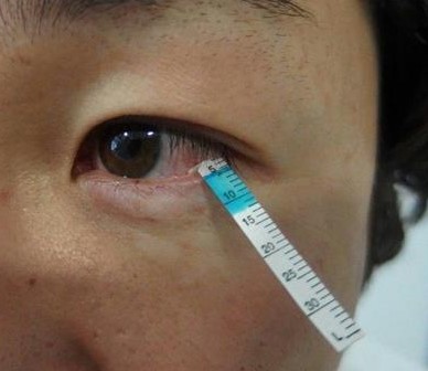 短冊状の濾紙を眼角に挟み涙液分泌量をみる検査です。