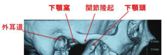 下顎頭----下アゴの骨の後上方に伸びた先の部分で、ここを中心にアゴが動きます。