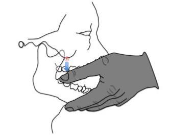 施術者は両方の親指を下顎臼歯咬合面に置き、口腔外の両手の他の指で下顎を支えます。