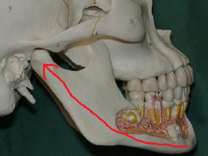オトガイ部に加わった力が下顎頭にダメージを与えます。