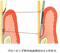 2)プロービング時の出血 PD測定後に出血部位の有無を調べます。 BOPは歯周病のその時点での活動状況を示します。 BOPが顕著な場合には、歯周病は活動的で進行傾向にあると考えられます。