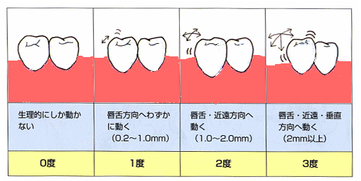 3)動揺度(M0−M3まで) 健常な歯は動きませんが、歯周疾患の進行に伴い、歯牙の動揺が生じます。 そり動きの程度を調べることで、歯周疾患の進行度が分かります。
