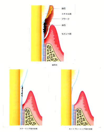3)SRP(スケーリング・ルートプレーニング) スケーリングは歯に付着したプラーク、歯石、その他の沈着物を機械的に除去することですが SRPはそれに加えてポケットに面する根表面の粗造で代謝産物を含む病的なセメント質を除 去して、滑沢な歯面にすることです。 また、歯肉縁下の細菌性プラークはバイオフィルムのように作用しているので抗微生物手段 での破壊は困難ですが、SRPによって物理的に破壊し除去できることが知られています。