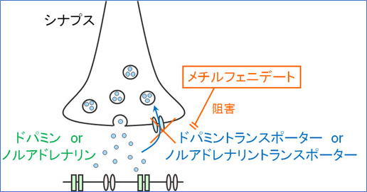 ドーパミン及びノルアドレナリン再取り込み阻害作用によって前頭前皮質や線条体を刺激し、脳機能の一部