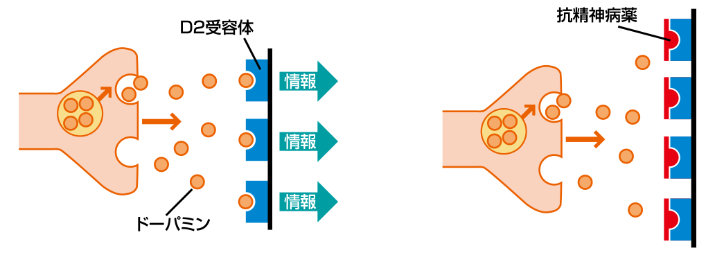 抗精神病薬は、ドパミンのD2受容体を遮断することにより精神病症状を緩和します。
