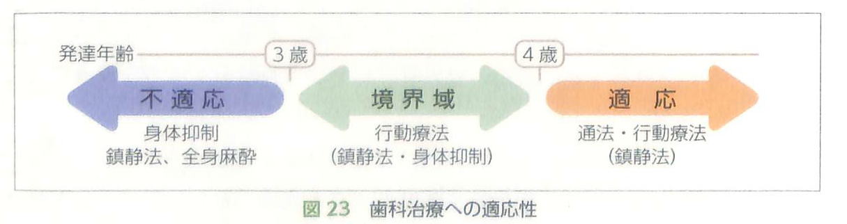 知的、あるいは精神発達程度と歯科診療への適応性は大きな関連性があり、発達年齢が3歳半〜4歳以上で