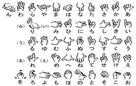 指文字:指の形で五十音を表現するもので、手話にない単語に用いられる.