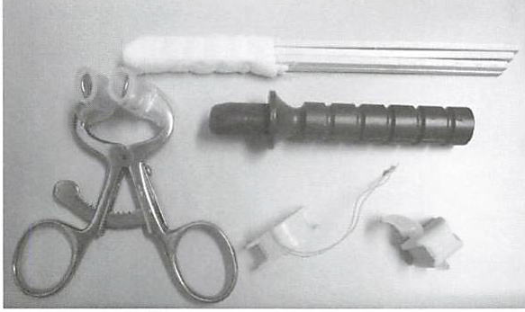 開口器、バイトブロック 割り箸にガーゼを巻いたもの など。