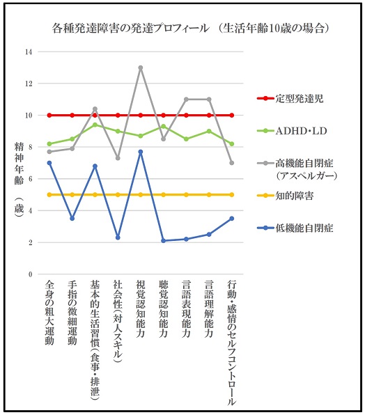 折れ線グラフのように記され、発達の全般的な遅れや、発達障害の特徴を把握すること が可能です。