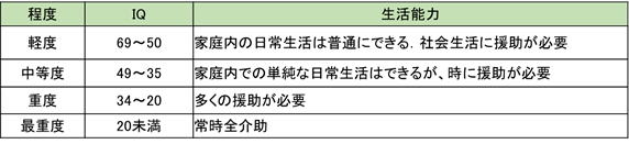 50−69は軽度、35−49は中度、20−34は重度、20未満は最重度知的障害とされます。