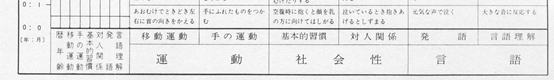 運動(移動運動・手の運動)、社会性(基本的習慣・対人関係)、言語(発語・言語理解)を観察し評価します。