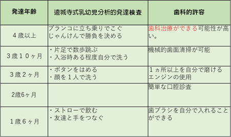 発達年齢が歯科治療の適応性(レディネス:発達と経験)に大きく関与します。