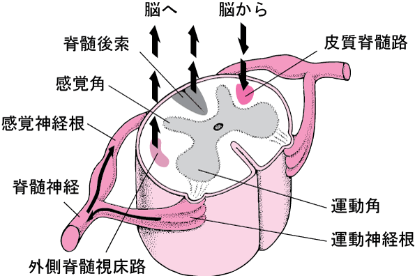 脊髄にある神経は、 脳と他の部位との間でやり取りされるメッセージを伝達します。