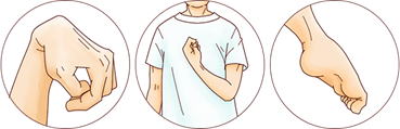 痙縮では、手指が握ったままとなり開こうとしても開きにくい、肘が曲がる、足先が足の裏側のほうに曲がってしまうなど