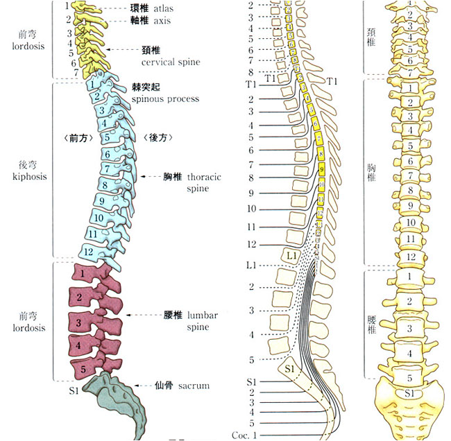 脊椎は、頸椎7椎、まれに8椎)、胸椎(12椎)、腰椎(5椎)、仙椎(5椎)および尾椎(3-6椎)の約30個の椎骨から形成