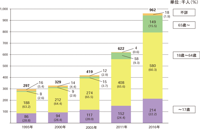 知的障害者:在宅者---厚生労働省「生活のしづらさなどに関する調査」 (2016年)