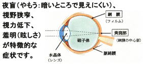 暗いところで物がみえにくく(夜盲)なり、視野が狭くなる難病の1つです。