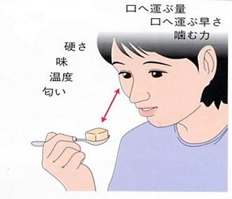 視覚・嗅覚・触覚などの感覚と、過去の食経験から目前の食物の 性質(物性、味、温度など)を感知します。