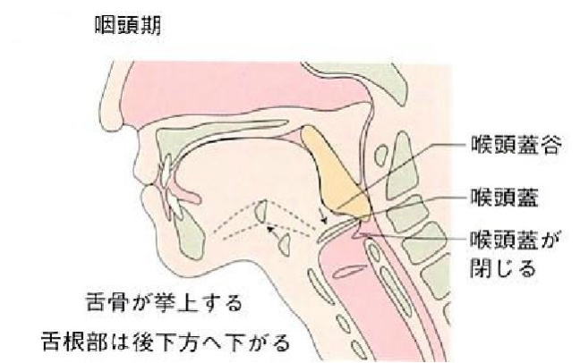 咽頭期=嚥下反射による嚥下関連筋群の協調運動により、中咽頭から 食道入口部に送り込まれるまでの、