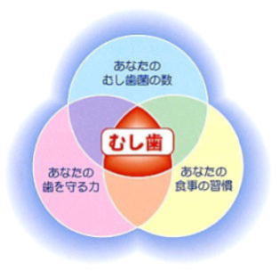 虫歯の発症には、次の3大要因が大きく関与しています。 @細菌 : ミュータンス菌、乳酸菌など A基質 : 砂糖、炭水化物 B宿主 : 歯の質、歯並び、唾液の性状、全身疾患など