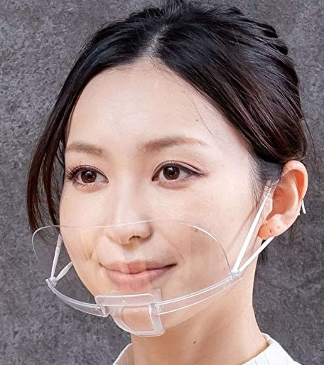 マウスシールドは、上部に大きな隙間があり、鼻がおおわれていません。