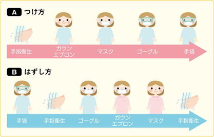 手袋→ゴーグル・フェイスシールド→エプロン・ガウン→マスク