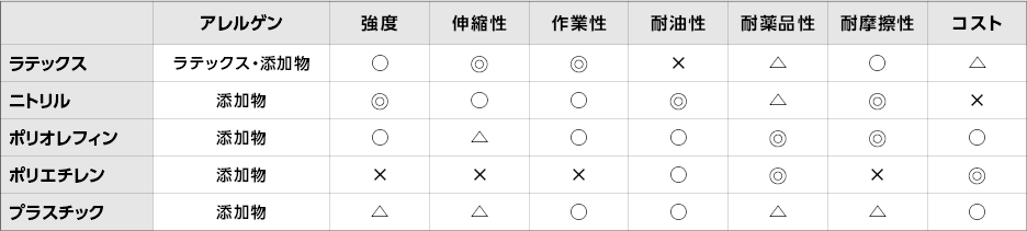 代表的な材質としては、天然ゴムラテックス、ニトリル、ポリ塩化ビニル、ポリエチレン、の4つが挙げられます。