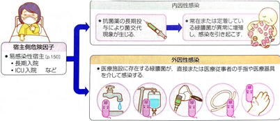 緑膿菌は、環境中に広く分布する細菌であるため、輸液用の製剤や点滴回路が汚染された場合、人為的に血中に菌