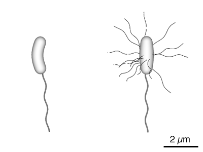 左:コレラ菌の模式図。典型的なビブリオの特徴であるコンマ状の桿菌で太い単毛性鞭毛(極鞭毛)を持つ。